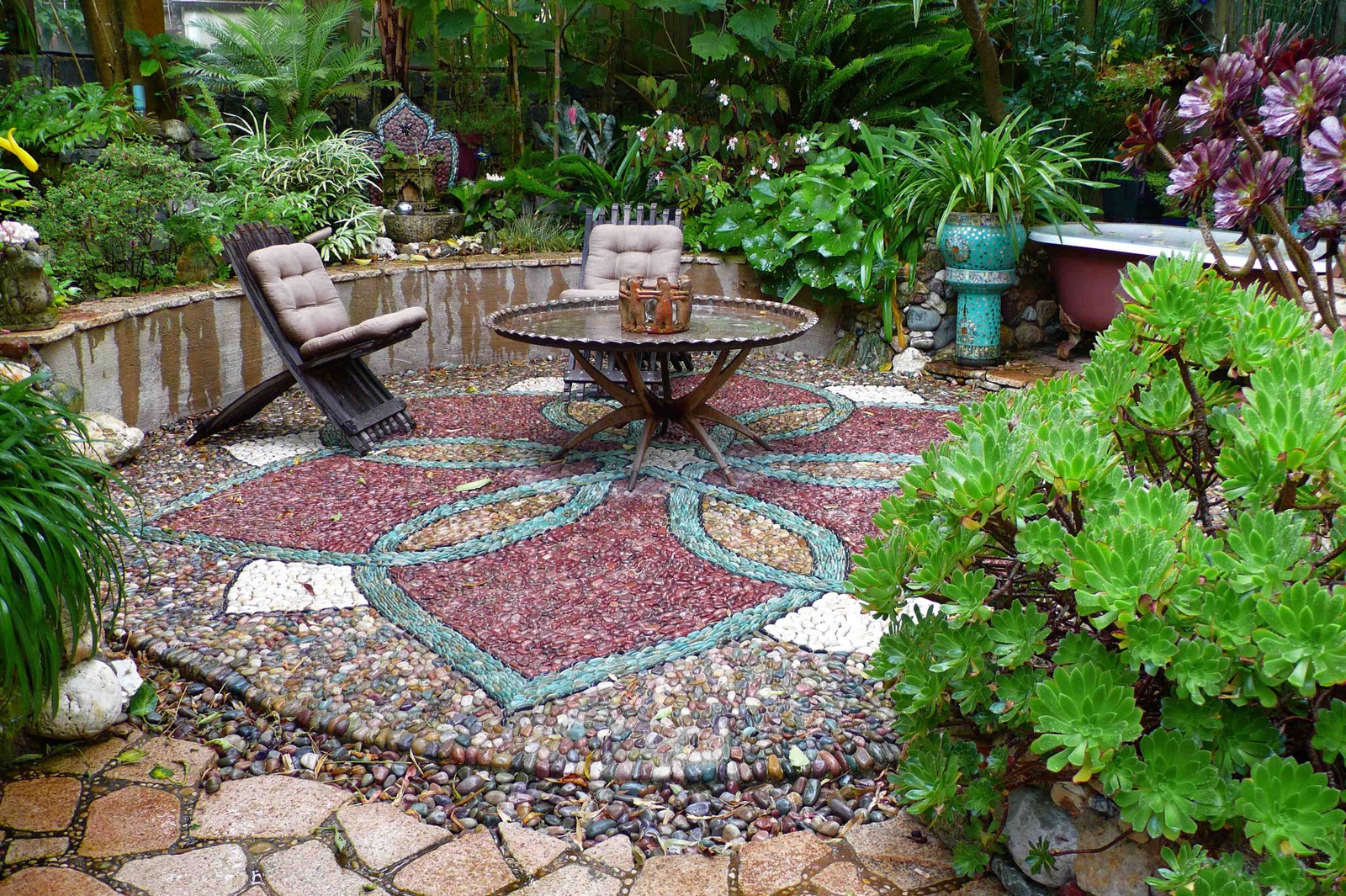 Два прекрасно сочетающихся материала — черепки и элементы из морозостойкой керамики — составят эффектный контраст небольшим округлым булыжникам землистого и сероватого цветов.