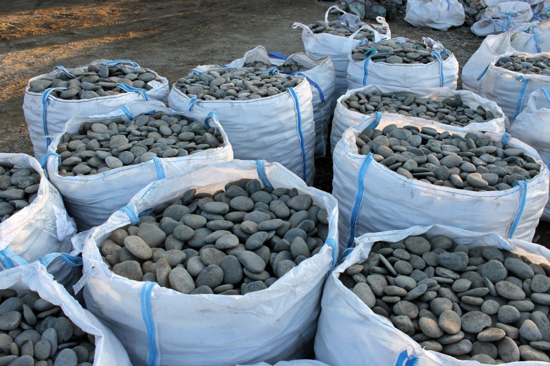 Крупная галька этого типоразмера (от 100 до 300 мм) уже напоминает небольшие валунчики: это красивый и гладкий речной камень, получивший свою округлую форму от сил природы – волн и течений. Благодаря удобной уплощенности отделка этим натуральным камнем становится очень простой: по сути, это готовая естественная облицовочная плитка или брусчатка для мощения. Такая галька, цена которой у нас низка благодаря собственной добыче, отпускается в мягких контейнерах или насыпом в кузов машины, тоннами. Эти симпатичные плоские натуральные камни у нас можно поистине удачно купить оптом!
